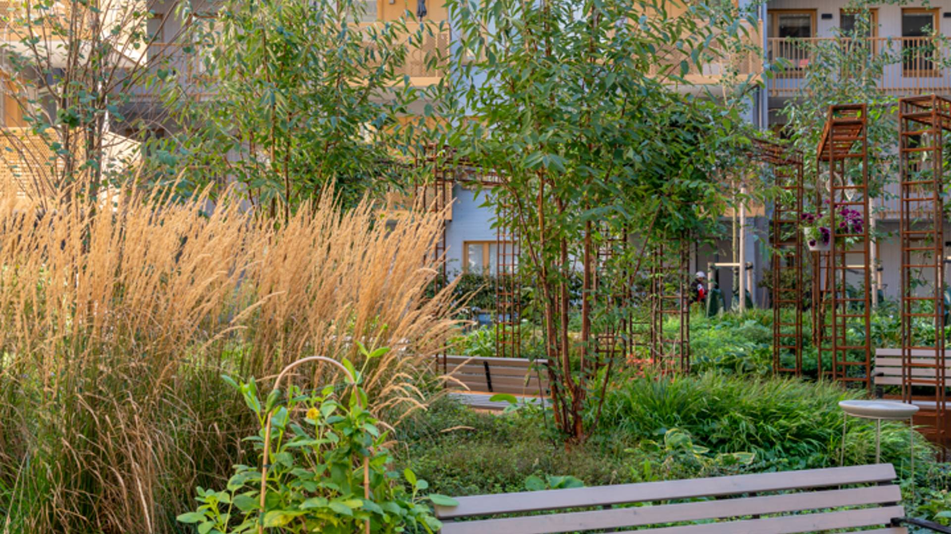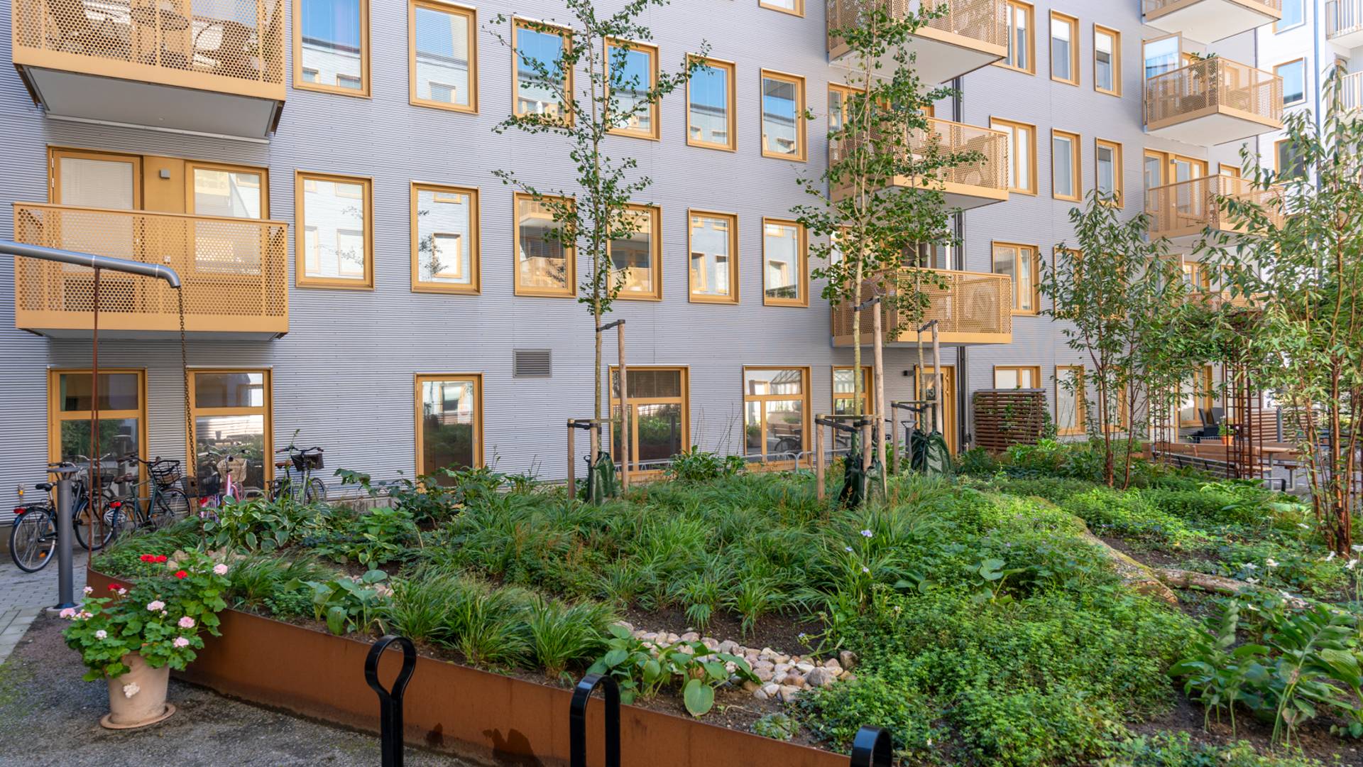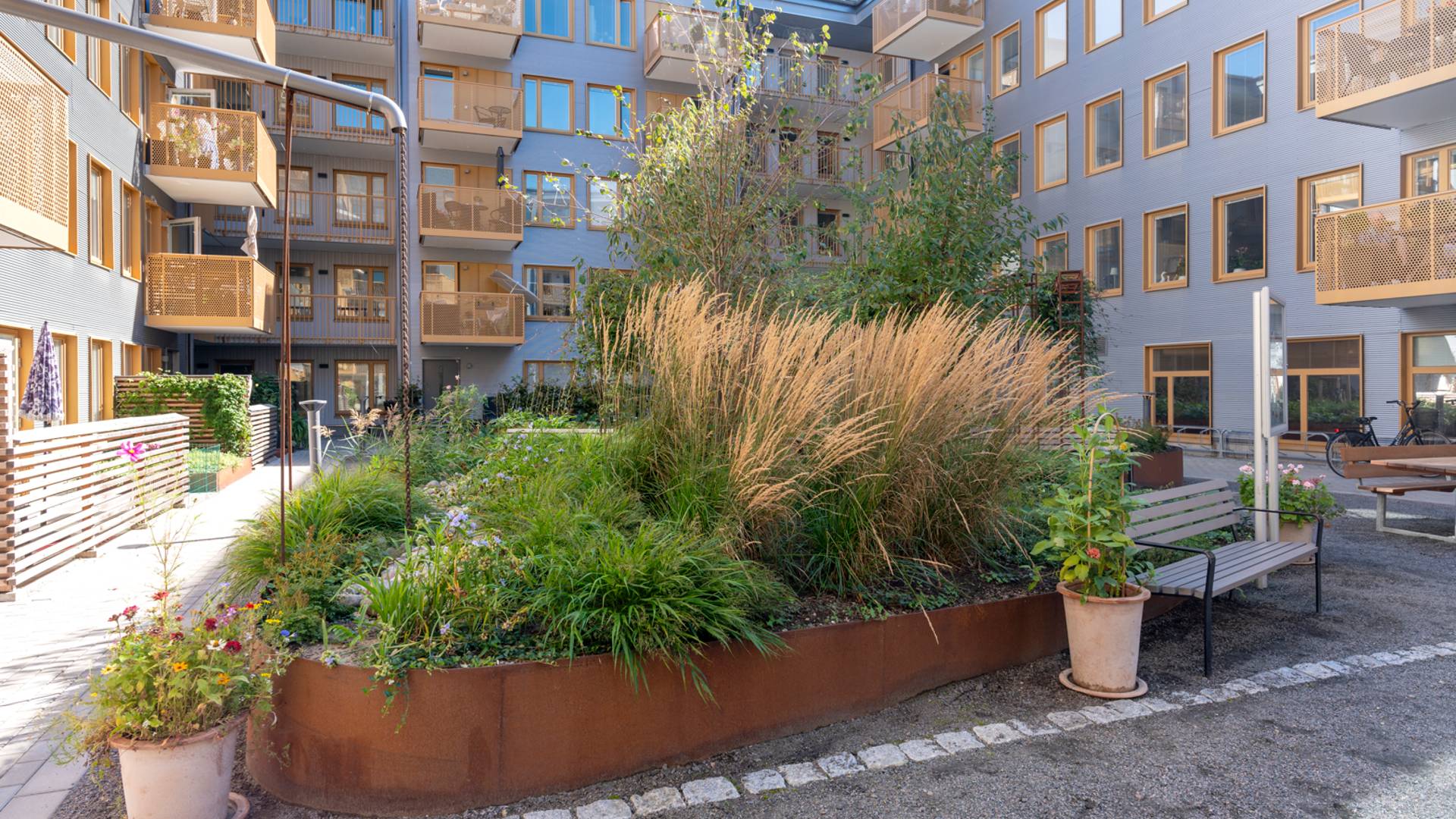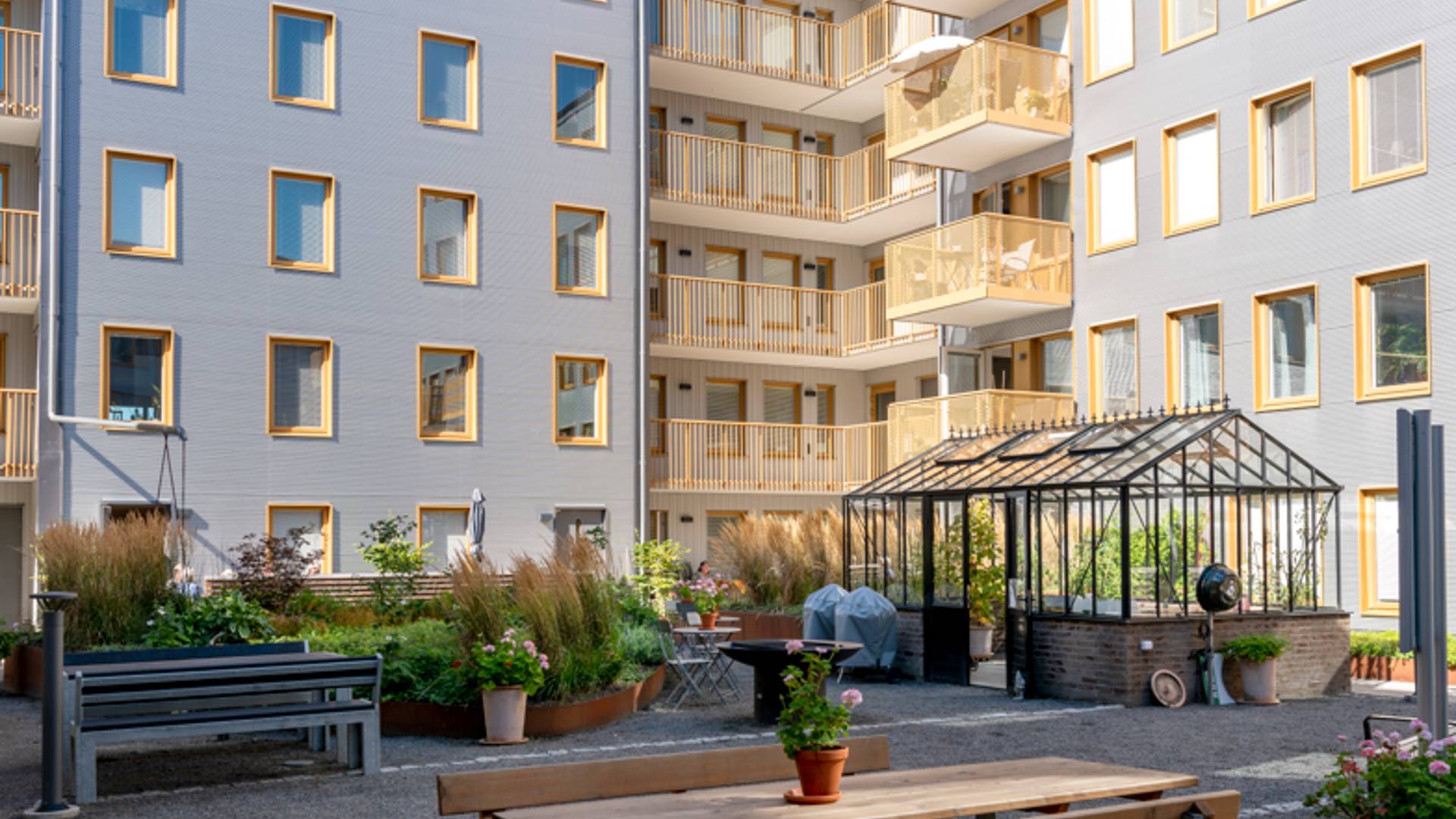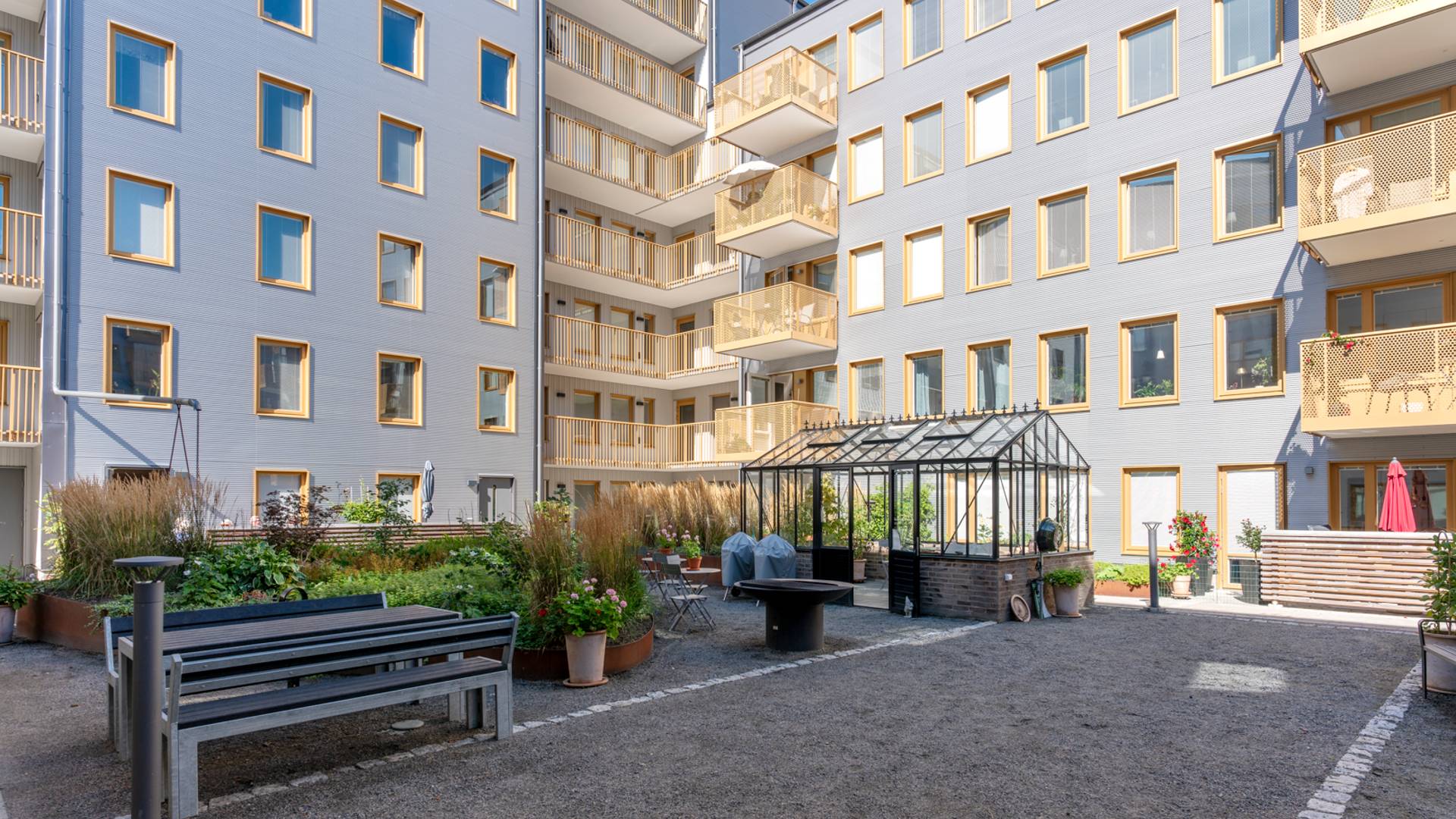 Lägenheterna är utrustade med disk- och tvättmaskin och de flesta har balkong eller uteplats. På innergården finns växthus, grill och sittplatser. Inom fastigheten finns ett seniorgym, två stora gemensamhetslokaler samt en gästlägenhet.