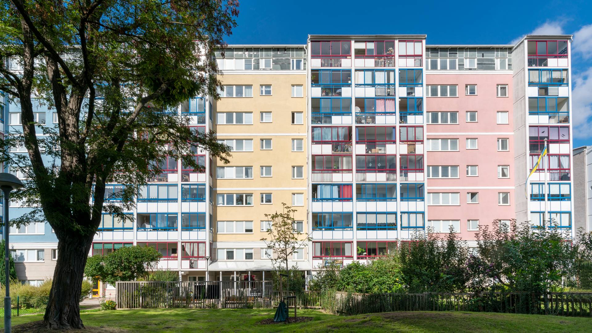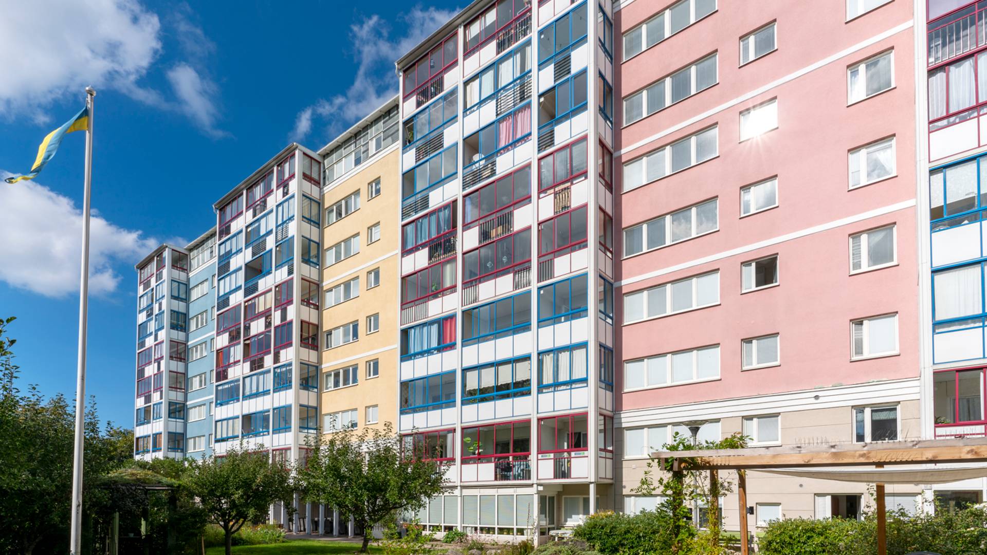 Här finns 70 lägenheter fördelade på 2–3 rum och kök och en trevlig grönskande gård med goda möjligheter till umgänge och grillning sommartid!