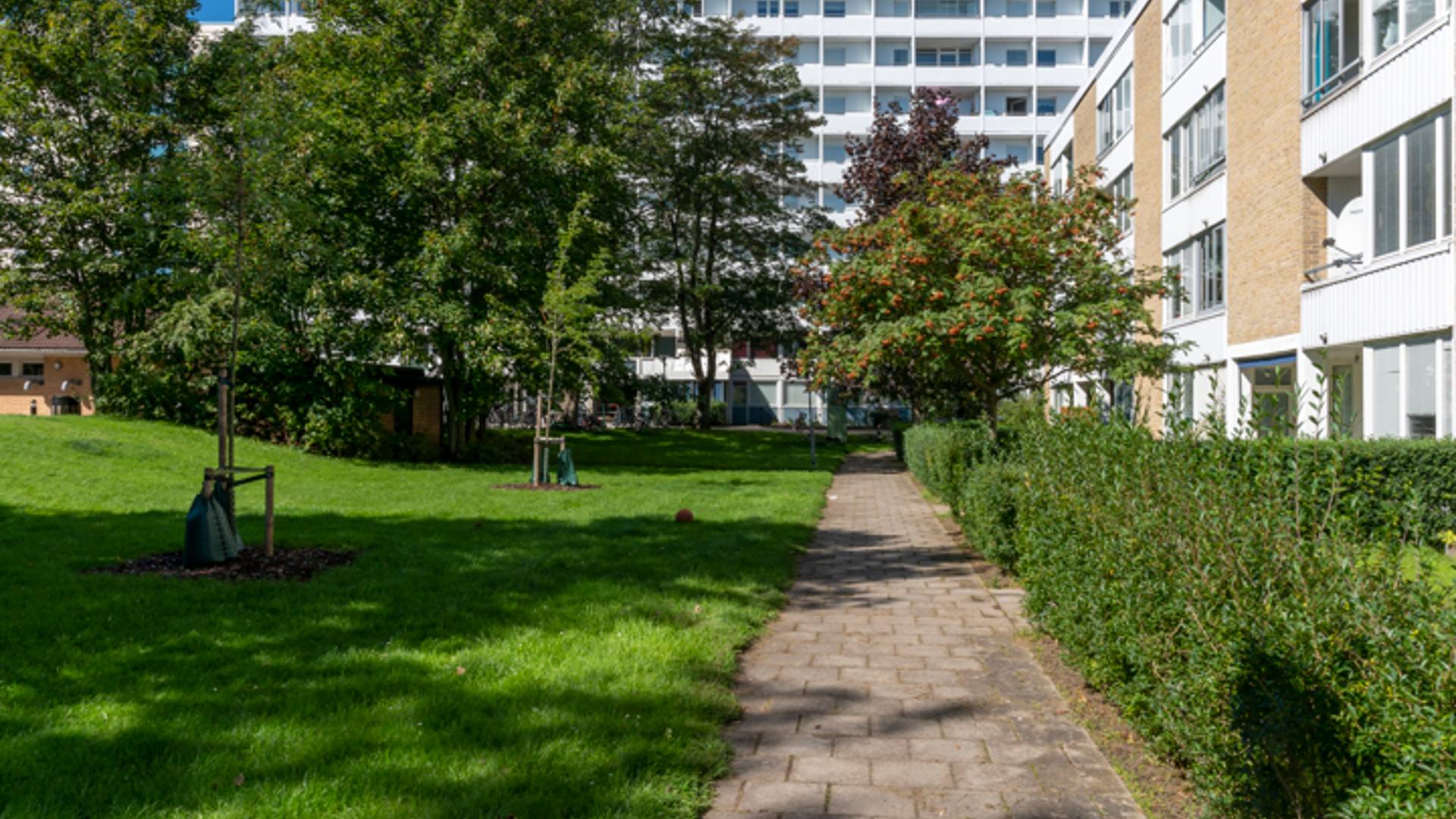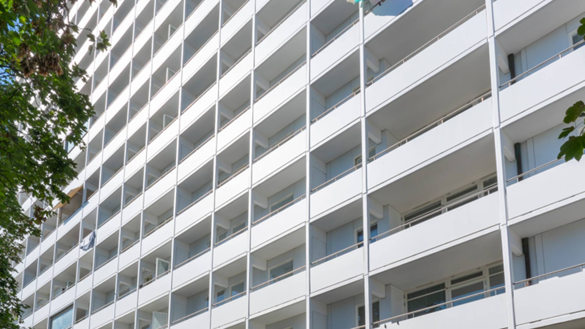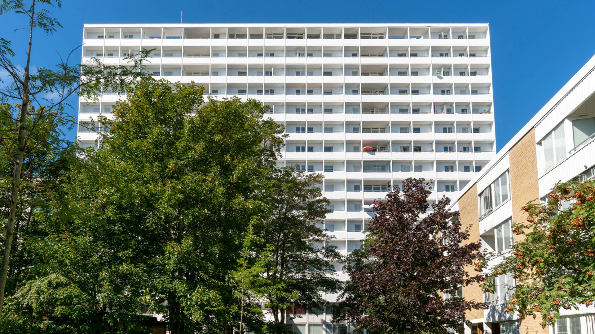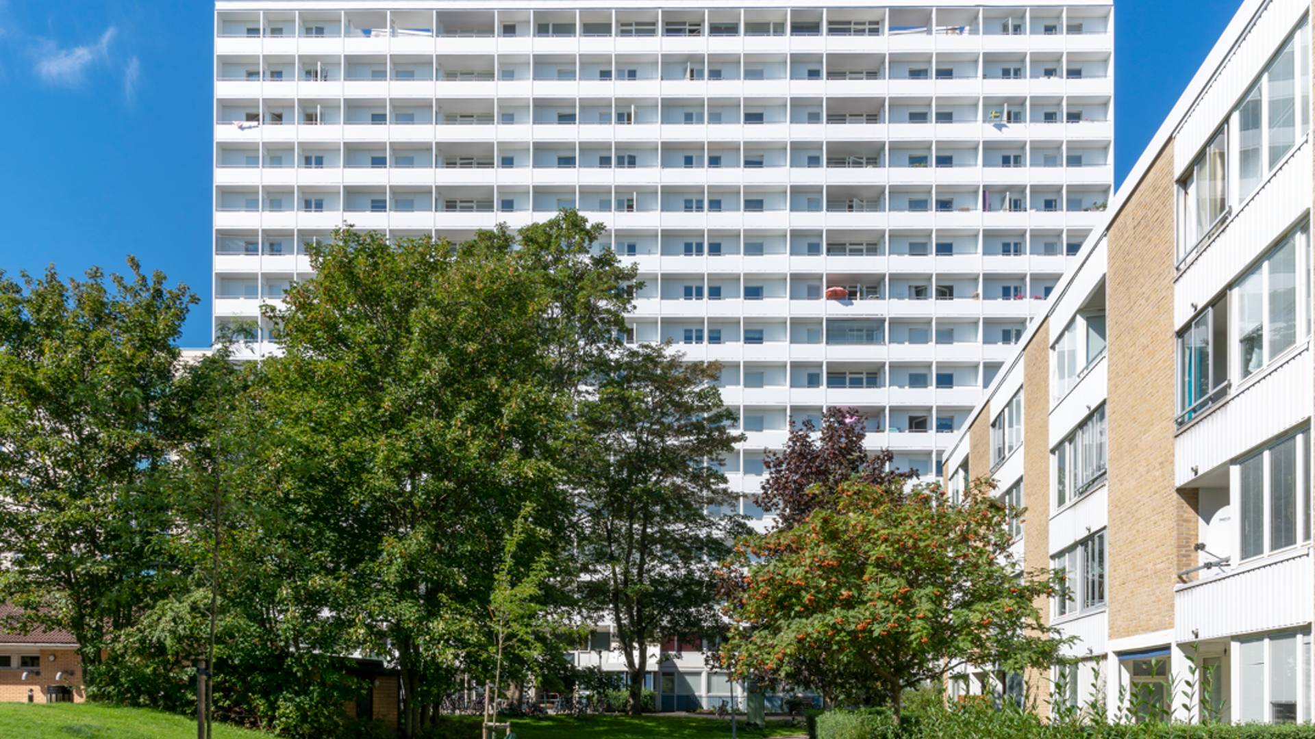 Fastigheten är byggd 1959 och består av 65 lägenheter. Husets fasad har precis genomgått en omfattande renovering.