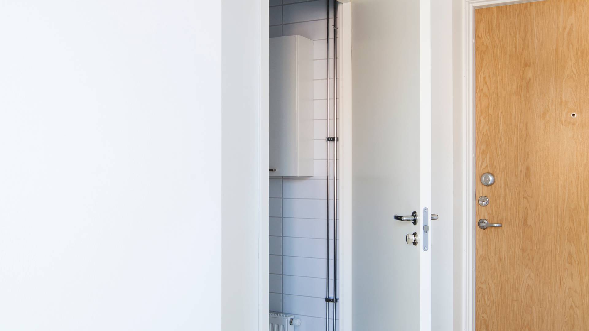På översta våningen finns fyra rymliga etagelägenheter på 40 kvadratmeter – tvårummare med eget kokskåp. Förutom de gemensamma köken finns generösa gemensamma ytor för umgänge, spel eller en filmkväll. Tvättstugan ligger högst upp, och under det ljusa halvåret är den stora takterrassen en självklar samlingspunkt.