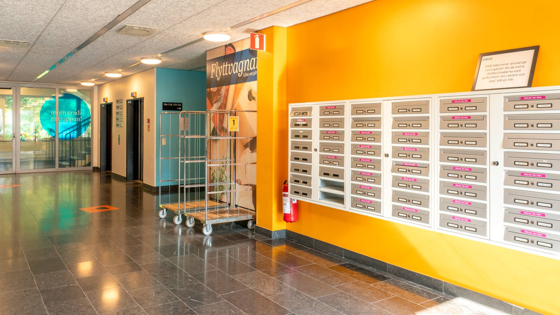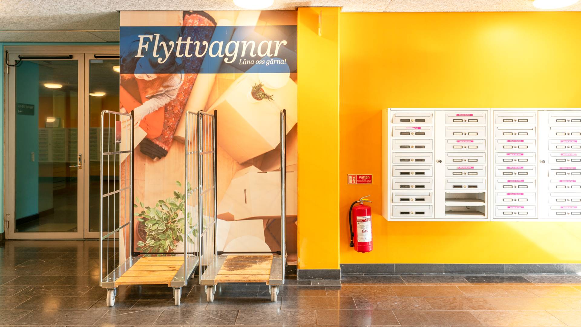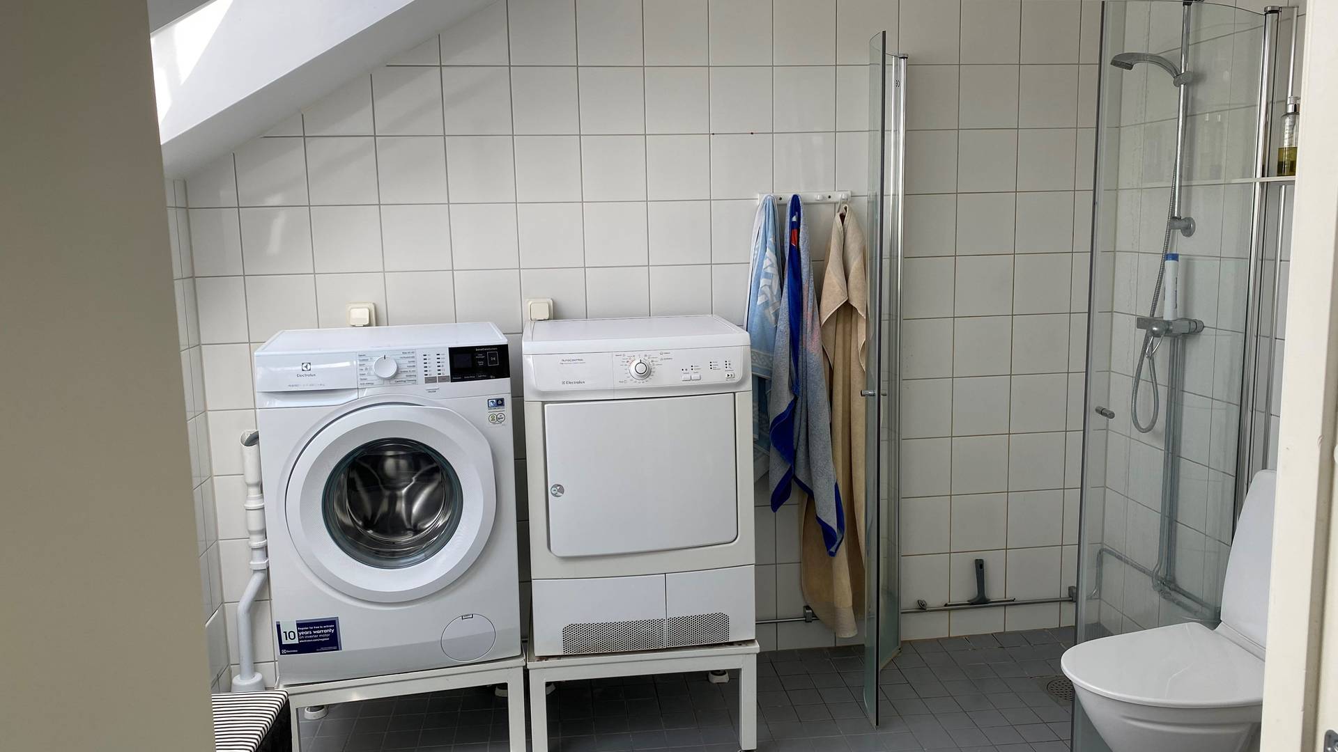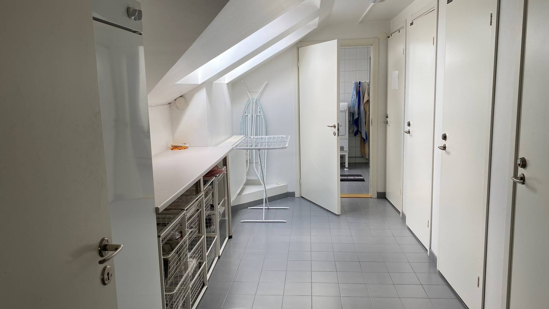 Tvättstugan ligger smidigt på samma våningsplan som lägenheterna, och fastigheten har en trevlig innergård som är en populär mötesplats.