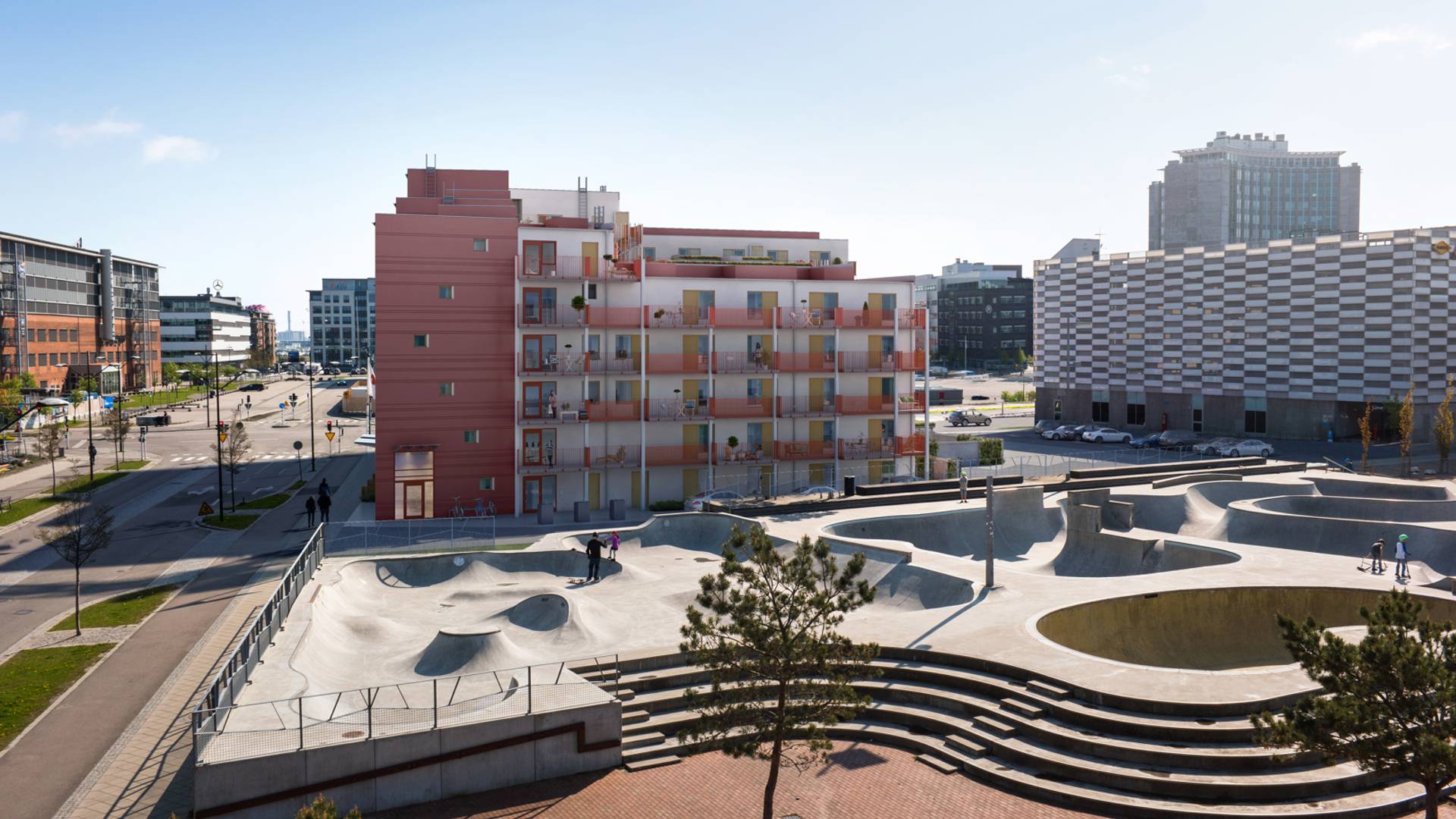 Stapelbädden är ett socialt hus med loftgångar och balkonger som skapar kontakt mellan grannar. Du har tillgång till en gemensam gård och ett studierum för fokuserade pluggsessioner. Utanför dörren väntar norra Europas största skatepark och ett café med skateboardprofil, drivet av föreningen Bryggeriet. Området erbjuder gott om träningsmöjligheter, restauranger, caféer och butiker – allt inom några minuters promenad.