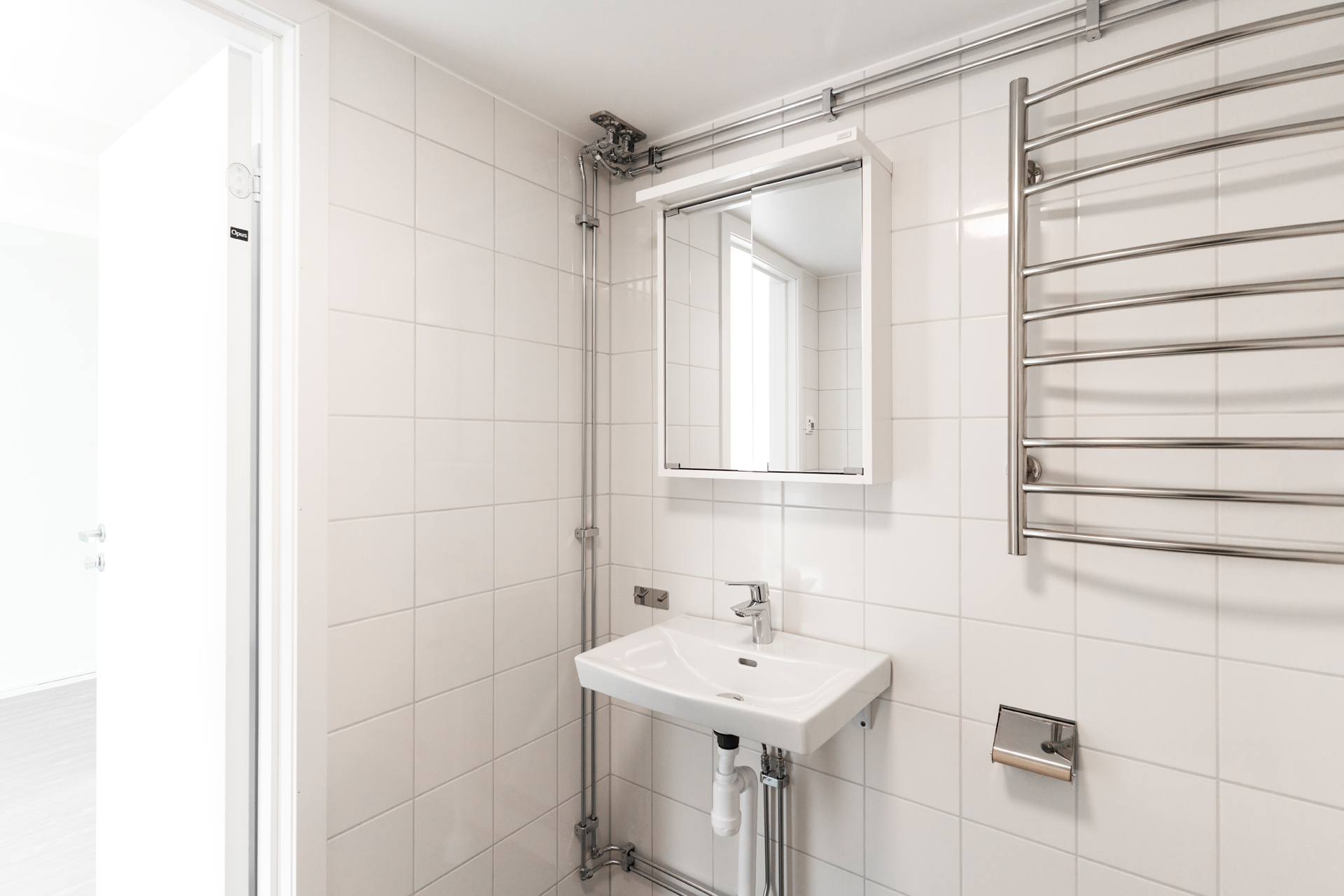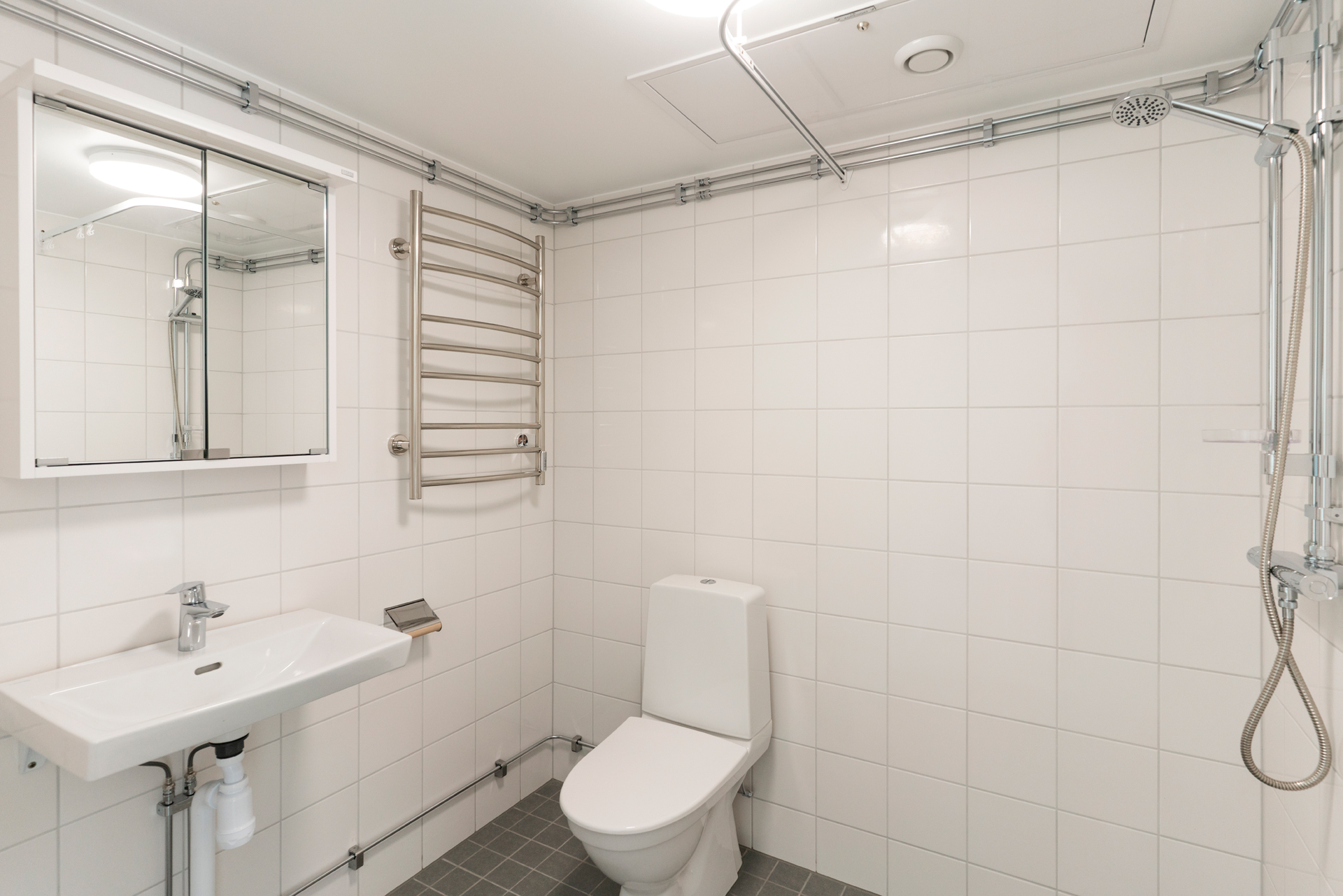 Utrustning: Dusch med duschstång, handdukstork, badrumsskåp med spegel