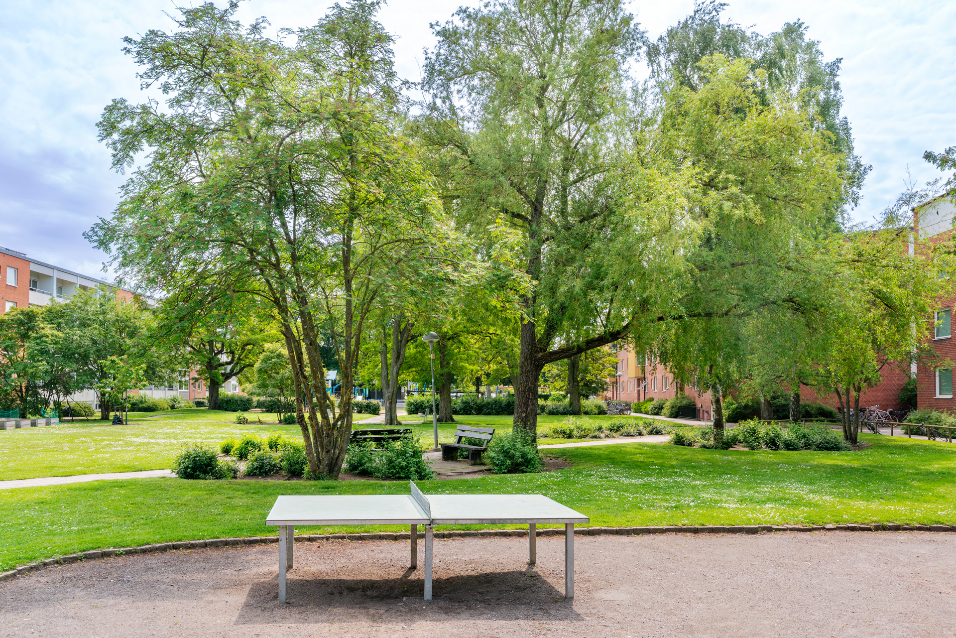 Stor innergård med grill och sittplatser samt lekredskap.