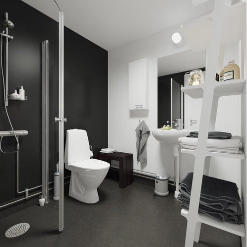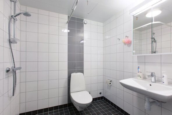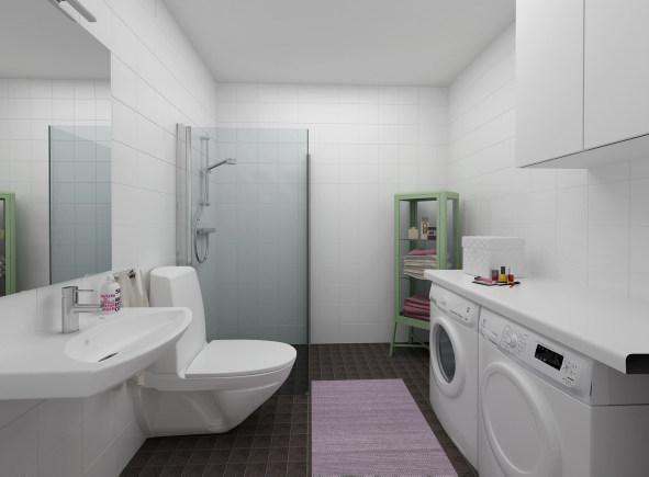 Övrigt: Tvättmaskin och torktumlare, handdukstork (el), komfortvärme (el), dubbla duschdörrar samt vägghängd wc-stol.