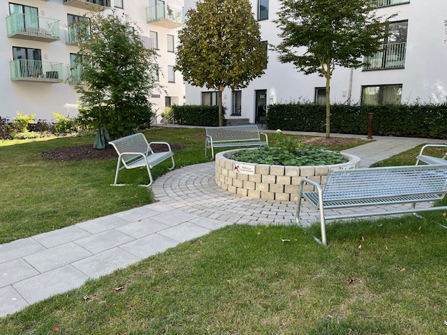 Det finns möjlighet att ställa cykeln dels inomhus i ett förråd på insidan av gården och utomhusplatser. Förråden finns nere i höjd med garaget.