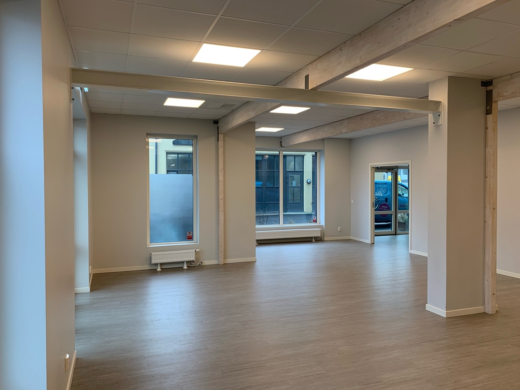 Med generös takhöjd och stora skyltfönster på två sidor får lokalen ett naturligt ljusinsläpp som skapar en inbjudande och fridfull atmosfär.